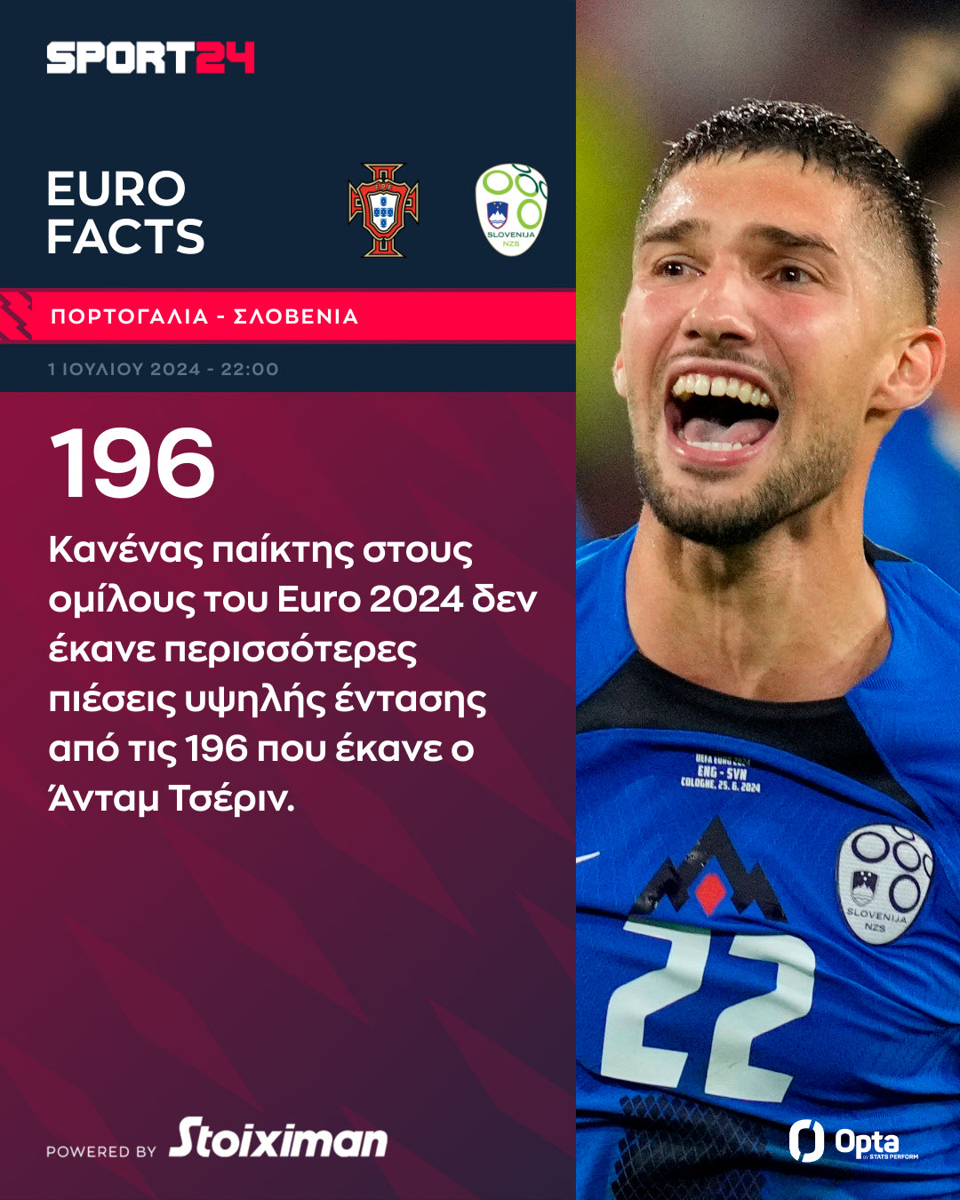 Η Πορτογαλία αντιμετωπίζει την Σλοβενία (1/7, 22:00, ΕΡΤ1, LIVE SPORT24) στη φάση των 16 του Euro 2024. Ένα ματς που κεντρίζει τα βλέμματα με τον Κριστιάνο Ρονάλντο να αντιμετωπίζει τους Σπόραρ, Τσέριν και Βέρμπιτς. Ας δούμε χρήσιμα στοιχεία για το παιχνίδι.