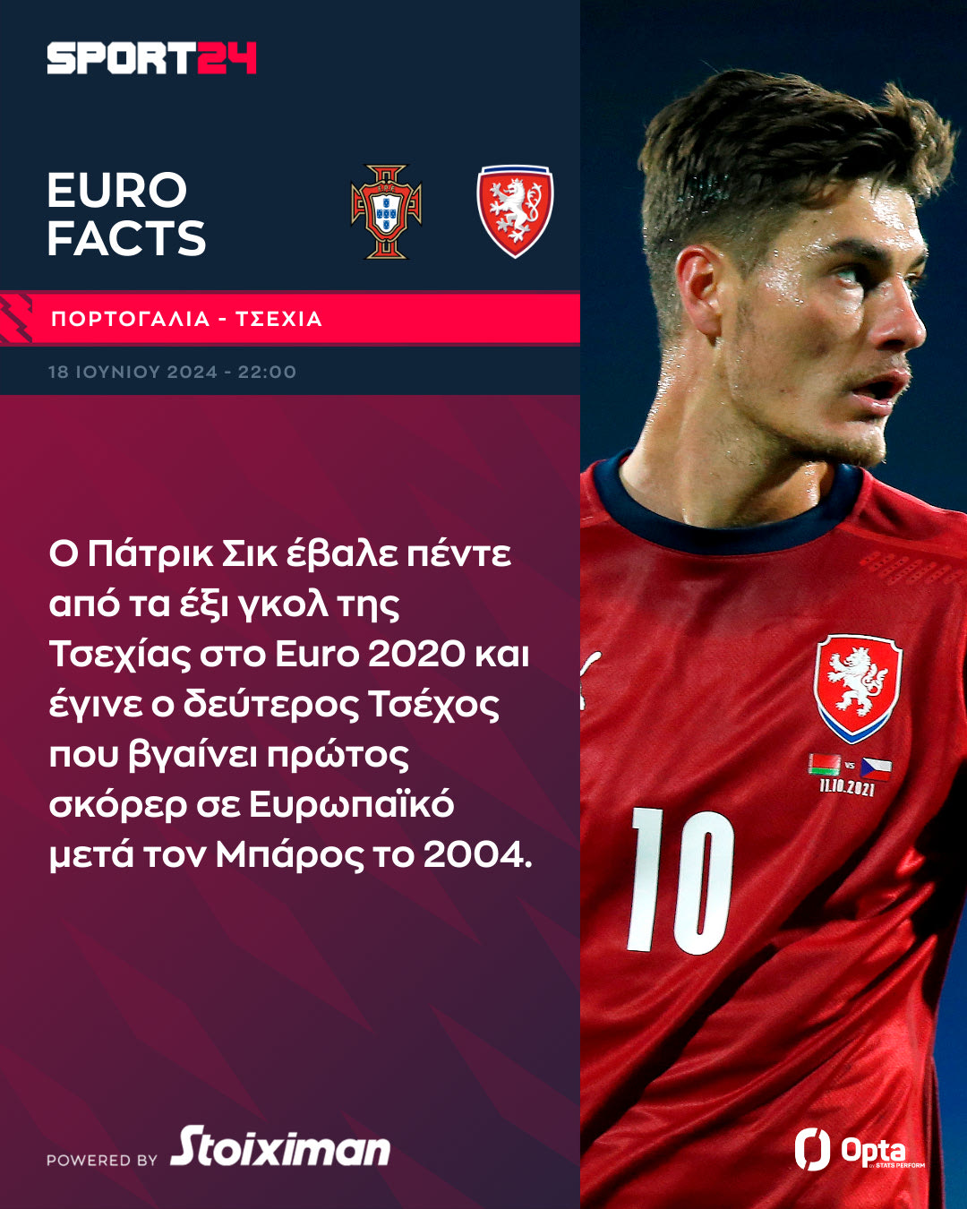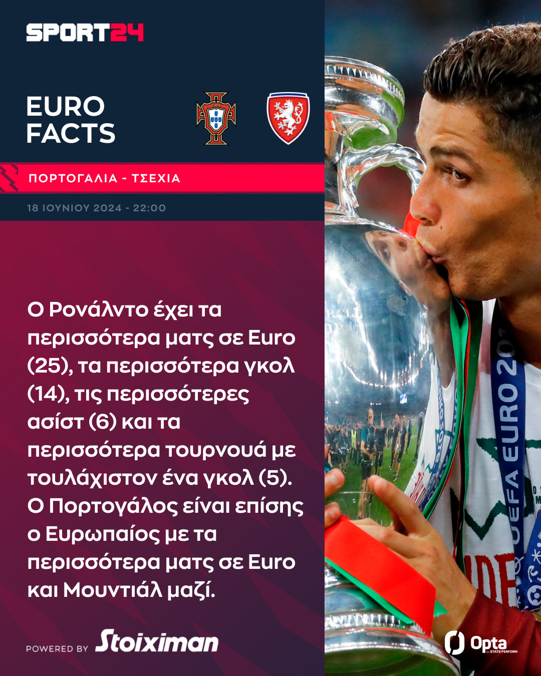 Πορτογαλία και Τσεχία ρίχνουν την αυλαία της πρώτης αγωνιστικής του Euro 2024 και το SPORT24 σας παρουσιάζει μερικά χρήσιμα Facts ενόψει της σπουδαίας αναμέτρησης, πάντα με τη βοήθεια της Opta.