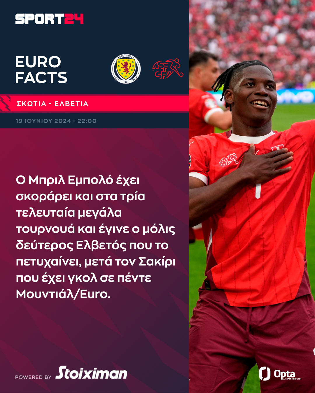 Ο Μπριλ Εμπολό έχει σκοράρει και στα τρία τελευταία μεγάλα τουρνουά και έγινε ο μόλις δεύτερος Ελβετός που το πετυχαίνει, μετά τον Σακίρι που είχε γκολ σε πέντε Μουντιάλ/Euro.