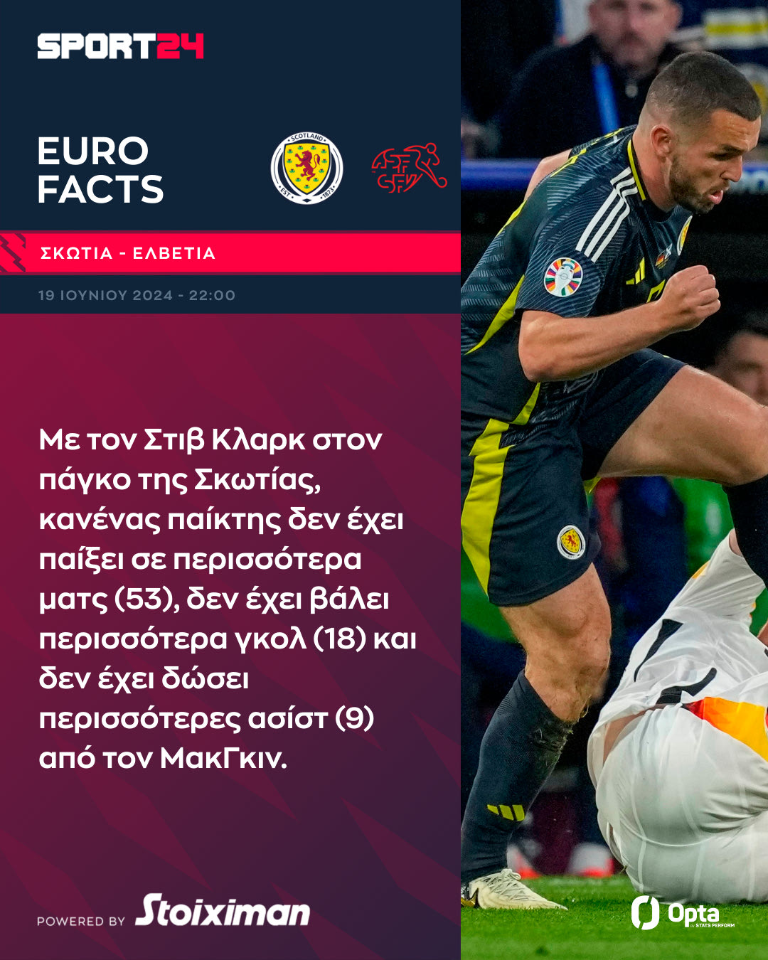 Η Σκωτία καίγεται για θετικό αποτέλεσμα μετά από τη συντριβή της στην πρεμιέρα του Euro 2024 ενώ η αντίπαλός της, Ελβετία, ευελπιστεί να "χτίσει" πάνω στην επιτυχία της κόντρα στην Ουγγαρία. Το SPORT24 σας παρουσιάζει μερικά χρήσιμα Facts ενόψει της σπουδαίας αναμέτρησης, πάντα με τη βοήθεια της Opta.