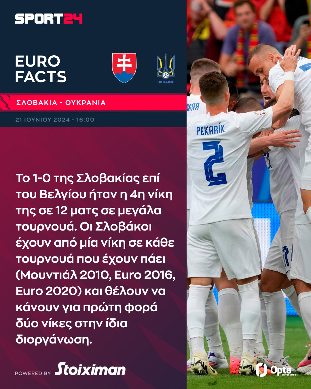 Το 1-0 της Σλοβακίας επί του Βελγίου στον πρώτο αγώνα του ομίλου ήταν η τέταρτη νίκη της σε 12 αγώνες σε μεγάλα τουρνουά. Οι Σλοβάκοι έχουν πετύχει από μία νίκη σε κάθε μεγάλο τουρνουά που έχουν συμμετάσχει (Μουντιάλ 2010, Euro 2016, Euro 2020, Euro 2024) και πλέον θέλουν να κάνουν για πρώτη φορά δύο νίκες στην ίδια διοργάνωση.