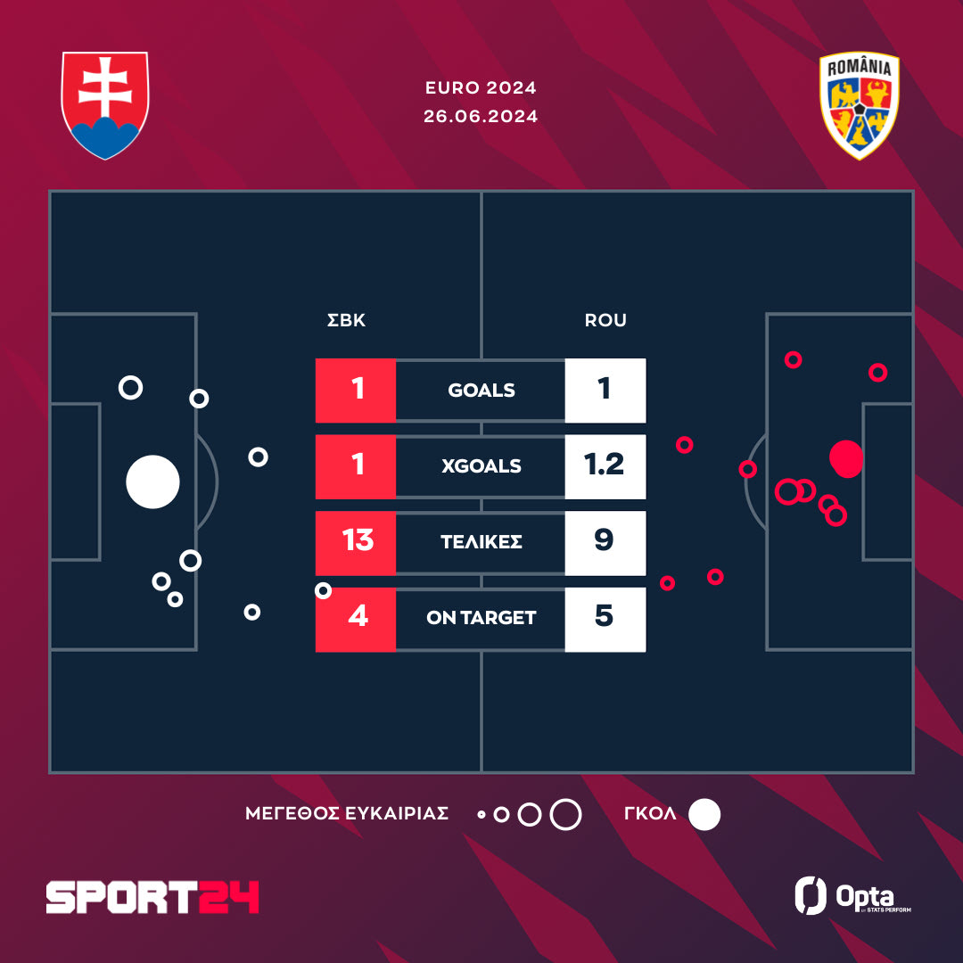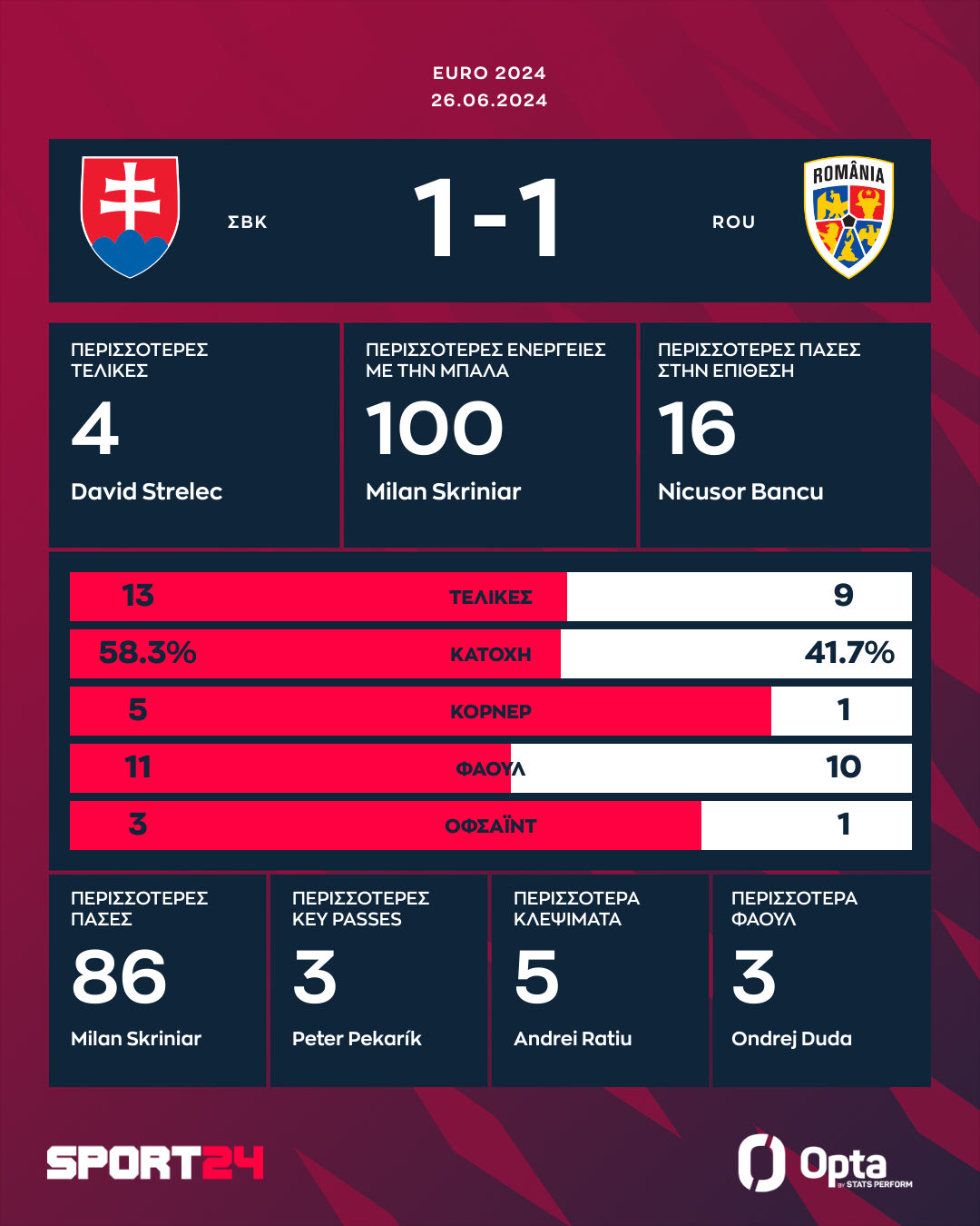 Ισόπαλο (1-1) έληξε το παιχνίδι μεταξύ της Σλοβακίας με τη Ρουμανία στη Φρανκφούρτη, το οποίο βόλεψε και τους δύο σε συνδυασμό με την ισοπαλία στο άλλο ματς.