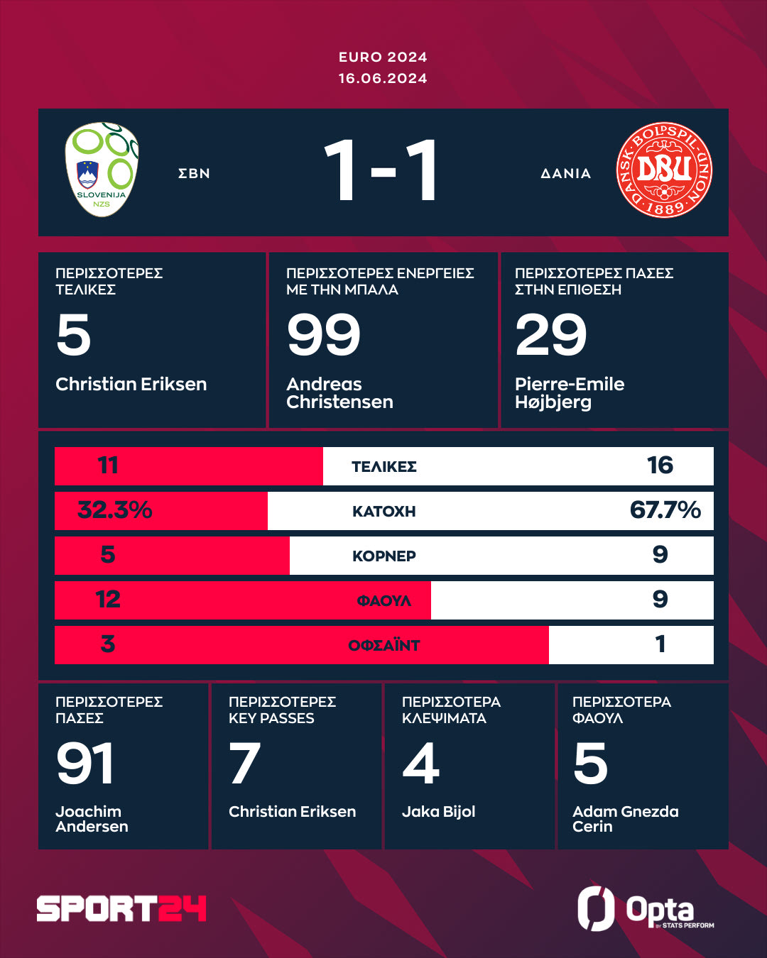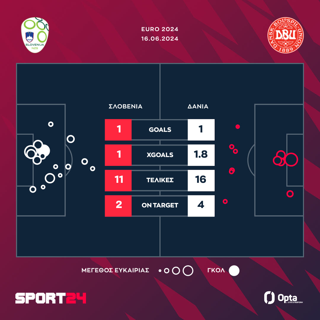 Η Δανία είχε το πάνω χέρι στο μεγαλύτερο μέρος του παιχνιδιού, με τον Κρίστιαν Έρικσεν να ανοίγει το σκορ στο 17ο λεπτό της αναμέτρησης. Ωστόσο, οι Σλοβένοι το πίστεψαν και κατάφεραν να φέρουν το ματς στα ίσα με το σουτ του Γιάνζα στο 77′.