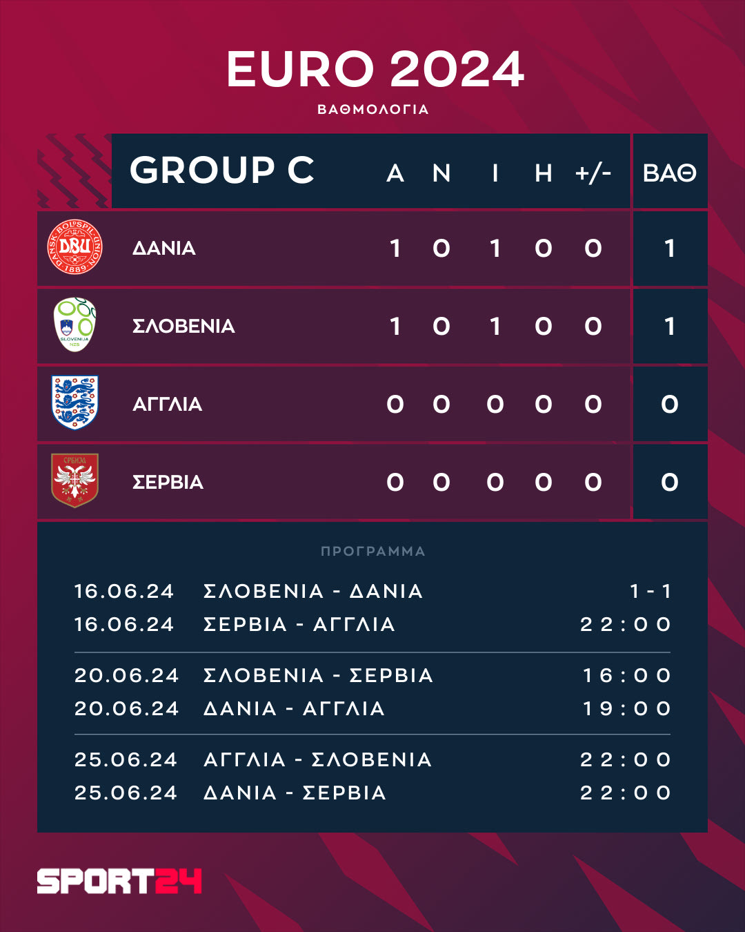 Ισόπαλο 1-1 έληξε το παιχνίδι της Σλοβενίας με την Δανία, με τον Έρικ Γιάνζα στο 77' να απαντάει στο γκολ του Έρικσεν από το 17ο λεπτό. Ο όμιλος που περιλαμβάνει επίσης Αγγλία και Σερβία αποκτάει άγρια ομορφιά.