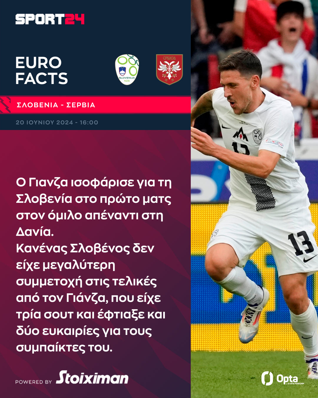 Ο Έρικ Γιανζα ισοφάρισε για τη Σλοβενία στο πρώτο ματς στον όμιλο απέναντι στη Δανία. Κανένας Σλοβένος δεν είχε μεγαλύτερη συμμετοχή στις τελικές από τον Γιάνζα, που είχε τρία σουτ και έφτιαξε και δύο ευκαιρίες για τους συμπαίκτες.