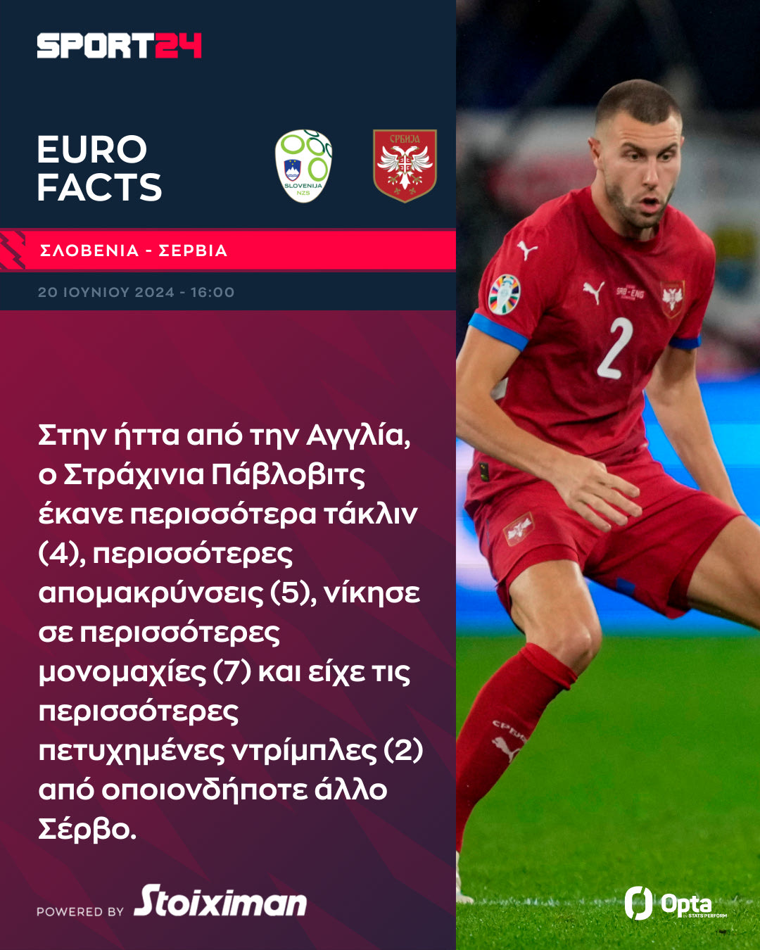 Σλοβενία και Σερβία θέλουν τη νίκη που θα τους ανοίξει διάπλατα τον δρόμο για την πρόκριση στα νόκ άουτ του Euro 2024 και το SPORT24 σας παρουσιάζει τα ιστορικά facts της αναμέτρησης με τη βοήθεια της Opta.