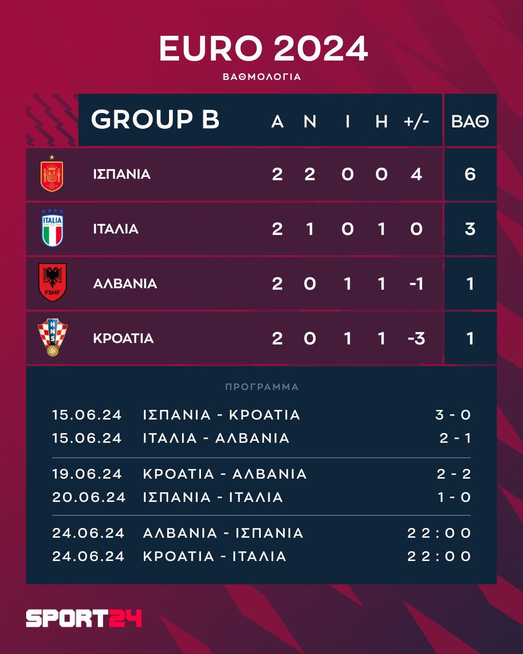 Δείτε πώς διαμορφώθηκε η βαθμολογία του δευτέρου ομίλου του Euro 2024, μετά την επικράτηση της Ισπανίας επί της Ιταλίας στη Βέλτινς Αρένα.