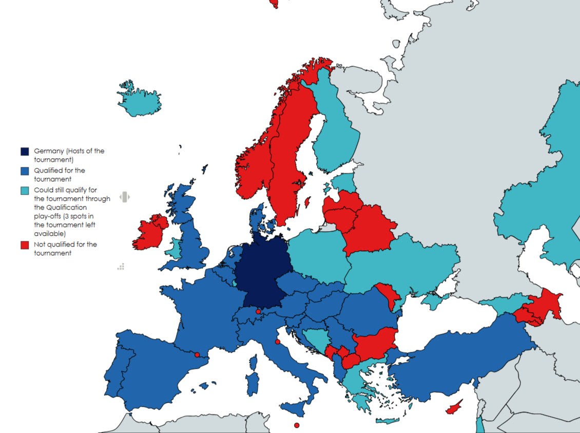 - Στο Euro 2024 από τα προκριματικά: Βέλγιο, Γαλλία, Πορτογαλία, Ισπανία, Σκωτία, Τουρκία, Αυστρία, Αγγλία, Ουγγαρία, Σλοβακία, Αλβανία, Δανία, Ολλανδία, Ελβετία, Ρουμανία, Σερβία, Τσεχία, Σλοβενία, Ιταλία, Κροατία