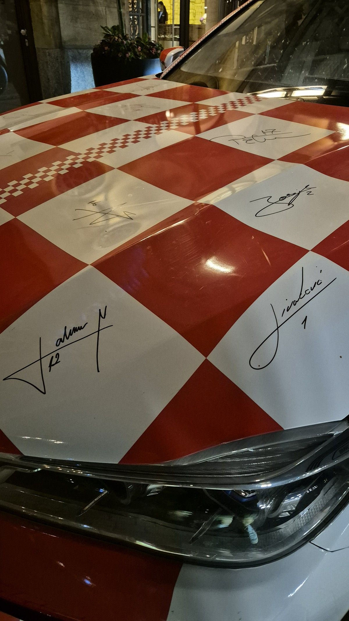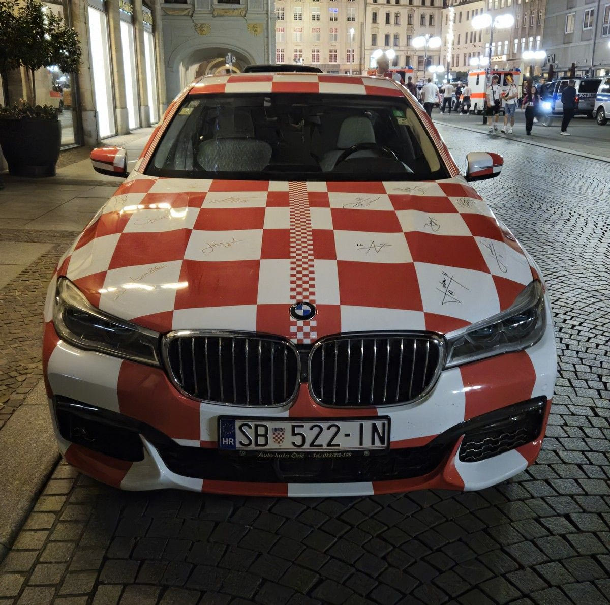 Μεταξύ των (χιλιάδων) φιλάθλων που ήρθαν οδικώς από την Κροατία στη Γερμανία κι αυτός που έχει το πιο ιδιαίτερο αυτοκίνητο που έχουμε δει στη διοργάνωση. Με την παραδοσιακή σκακιέρα της φανέλας και μια ακόμη μεγάλη ιδιαιτερότητα: τις υπογραφές των παικτών της “χρβάτσκα” στο καπό του!