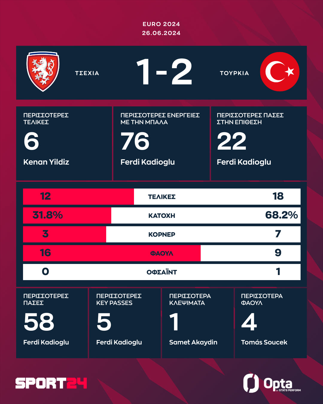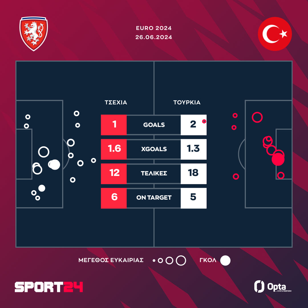 Η Τουρκία πήρε το εισιτήριο για τη φάση των 16 του Euro 2024. Οι παίκτες του Μοντέλα επικράτησαν 2-1 της Τσεχίας, η οποία πάλεψε έως το φινάλε, αλλά δεν κατάφερε να πάρει το τρίποντο και έτσι έμεινε εκτός διοργάνωσης.