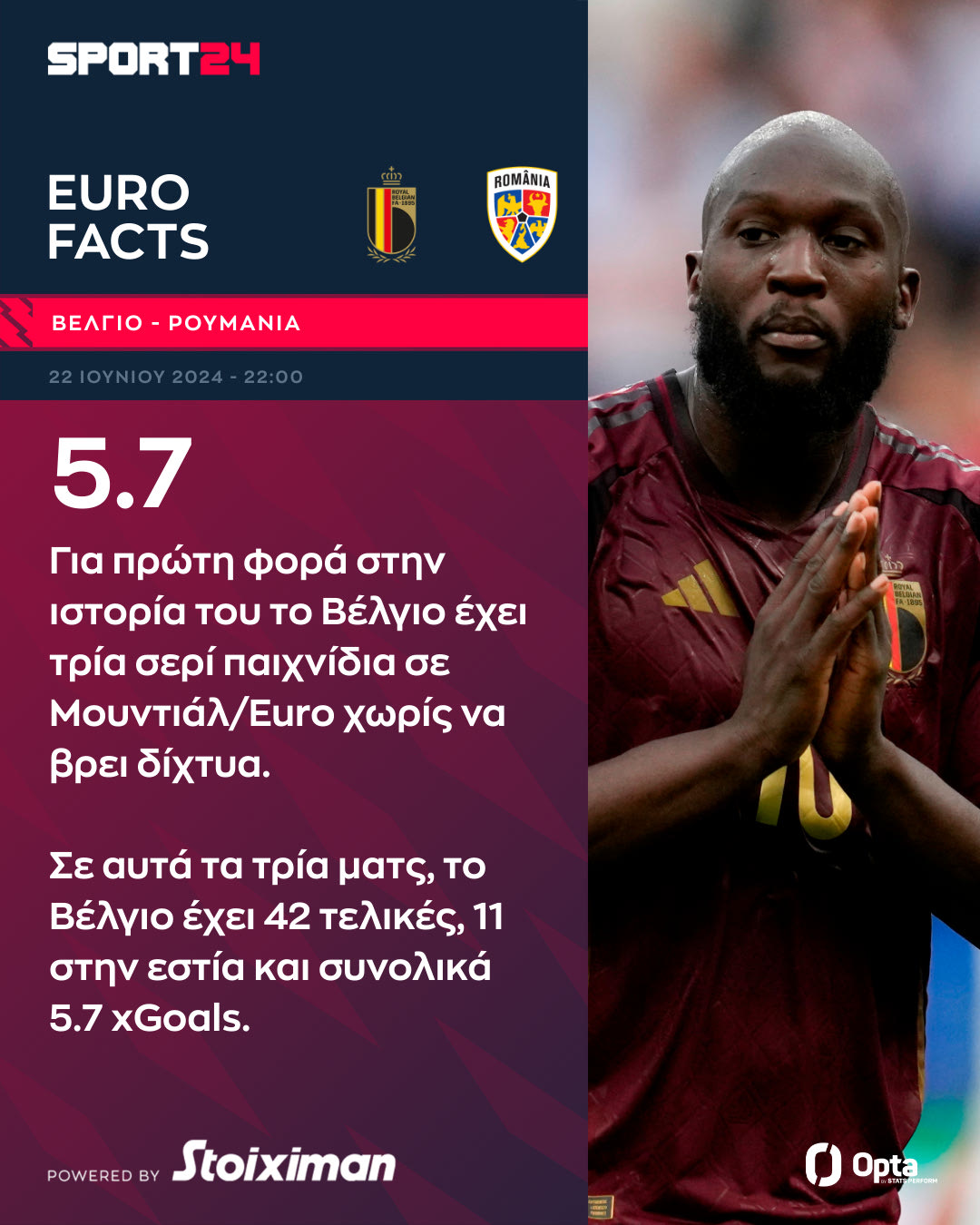 Το Βέλγιο κοντράρεται με την Ρουμανία (22/6, 22:00, ΕΡΤ1, LIVE SPORT24) στην 2η αγωνιστική του 5ου ομίλου του Euro 2024. Δείτε χρήσιμα στοιχεία με τη βοήθεια της Opta.