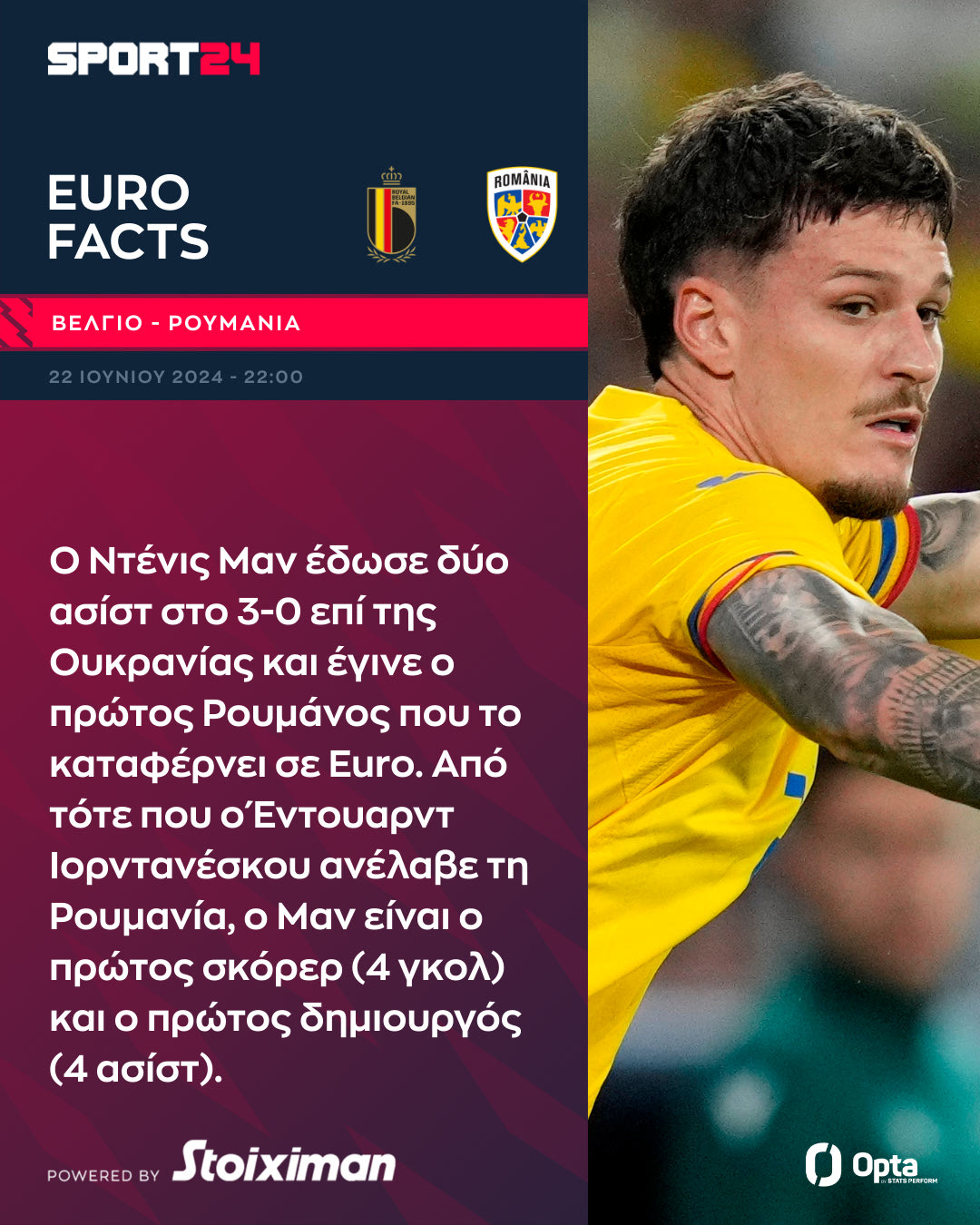 Ο Ντένις Μαν έδωσε δύο ασίστ στο 3-0 επί της Ουκρανίας και έγινε ο πρώτος Ρουμάνος που το καταφέρνει σε αγώνα Euro. Από τότε που ο Έντουαρντ Ιορντανέσκου ανέλαβε τη Ρουμανία, ο Μαν είναι ο πρώτος σκόρερ (4 γκολ) και ο πρώτος δημιουργός (4 ασίστ).