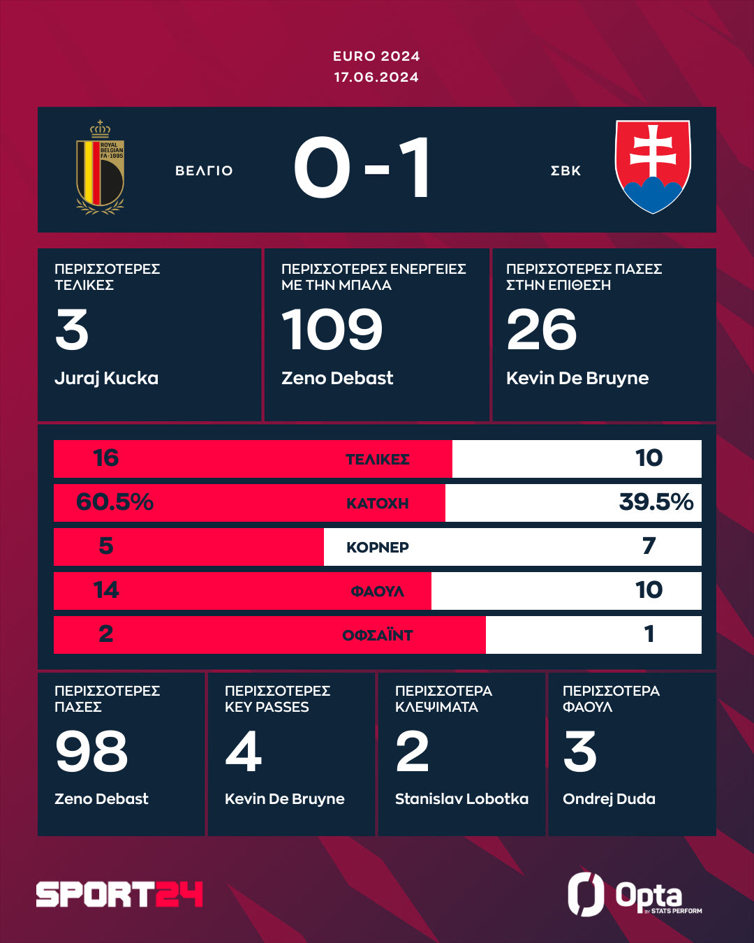Ο Σραντς ήταν αυτός που έδωσε προβάδισμα στην ομάδα του εκμεταλλευόμενος ένα λάθος του Ντοκού για να ακολουθήσει ένας επιθετικός μονόλογος από πλευράς Βέλγων που είχαν 16 τελικές, με καθαρές ευκαιρίες, 1,9 xgoals και δύο γκολ από τον Λουκάκου που ακυρώθηκαν με τη χρήση του VAR για να μείνει το 0-1 υπέρ των Σλοβάκων μέχρι το τέλος.