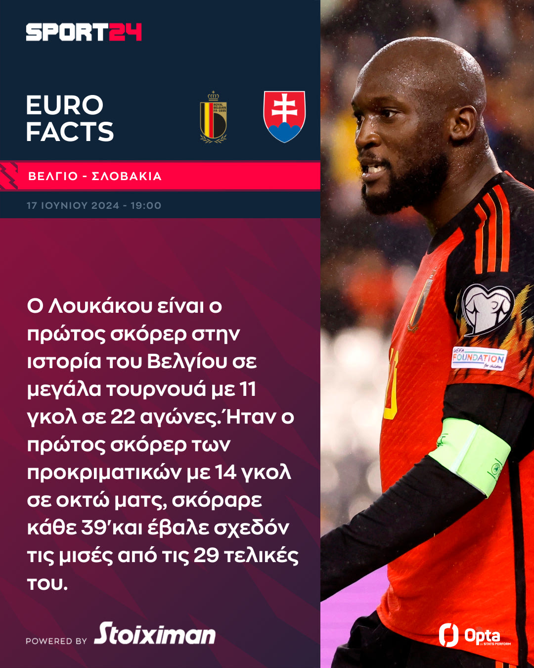Το Βέλγιο κοντράρεται με την Σλοβακία (17/6, 19:00, ΕΡΤ1, LIVE SPORT24) σ' ένα πολύ σημαντικό για τον "ανοιχτό" 5ο όμιλο. Δείτε στοιχεία για το παιχνίδι με την βοήθεια της Opta.