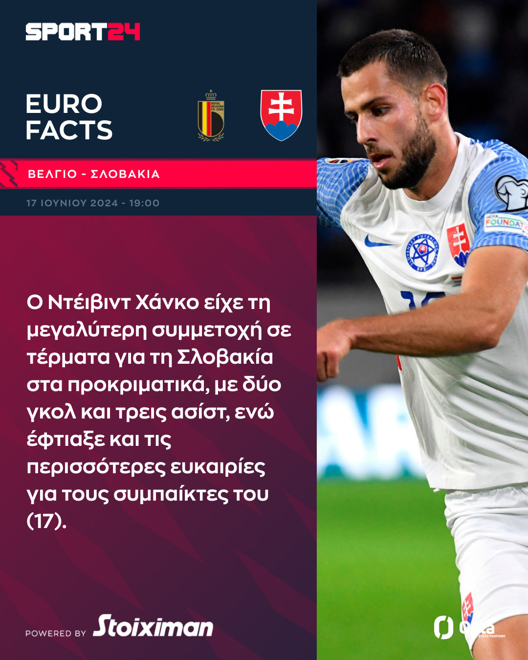 Ο Ντέιβιντ Χάνκο είχε τη μεγαλύτερη συμμετοχή σε τέρματα για τη Σλοβακία στα προκριματικά, με δύο γκολ και τρεις ασίστ, ενώ έφτιαξε και τις περισσότερες ευκαιρίες για τους συμπαίκτες του (17).