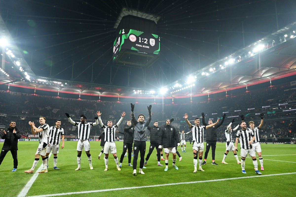Οι παίκτες του ΠΑΟΚ πανηγυρίζουν τη νίκη επί της Άιντραχτ για τη φάση των ομίλων του Europa Conference League 2023-2024 στο "Ντόιτσε Μπανκ Παρκ", Φρανκφούρτη | Πέμπτη 30 Νοεμβρίου 2023