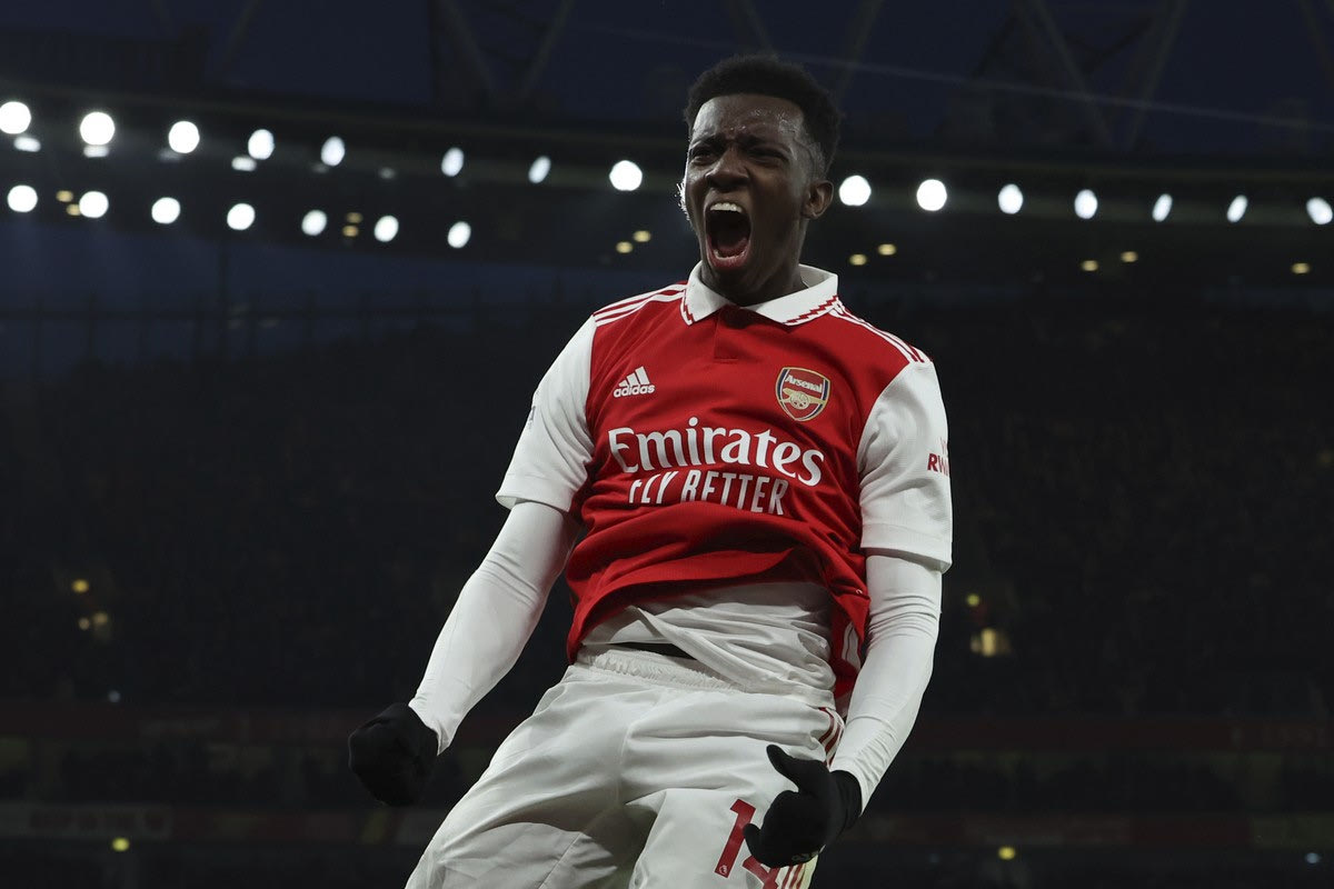 Ο Έντι Ενκέτια πανηγυρίζει γκολ της Άρσεναλ απέναντι στην Μάντσεστερ Γιουνάιτεντ | 22 Ιανουαρίου 2023 @2023 Ian Walton/AP IMAGES