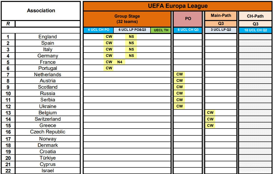 Όταν δε τα εγχώρια πρωταθλήματα βρίσκονται σε εξέλιξη, είναι ασαφές ακόμα και σε ποιον γύρο θα βρεθεί κάθε ομάδα. Για παράδειγμα, η Ελλάδα δικαιούται μια θέση στον προκριματικό γύρο που θα πάρει ο κάτοχος του εισιτηρίου για τον κυπελλούχο, όμως θα πρέπει να θεωρείται βέβαιο ότι θα “προβιβαστεί” στα playoffs και ουσιαστικά θα εξασφαλίσει ευρωπαϊκούς ομίλους στον Ολυμπιακό ή στον ΠΑΟΚ.