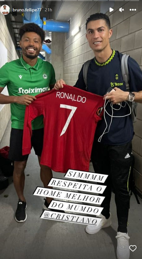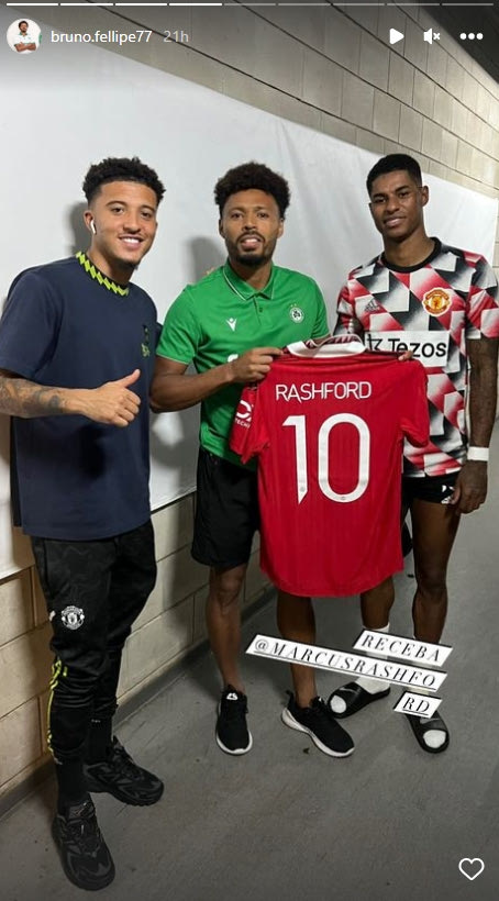 Ο Φελίπε Μπρούνο μετά το φινάλε του αγώνα με τη Γιουνάιτεντ έβγαλε φωτογραφίες με επτά παίκτες της, ενώ πήρε φανέλες του Κριστιάνο Ρονάλντο και του Μάρκους Ράσφορντ.