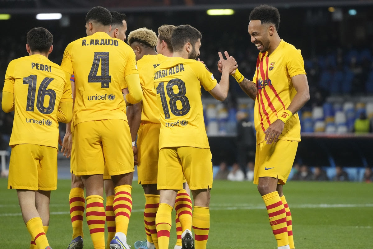 Οι παίκτες της Μπαρτσελόνα πανηγυρίζουν το γκολ του Άλμπα