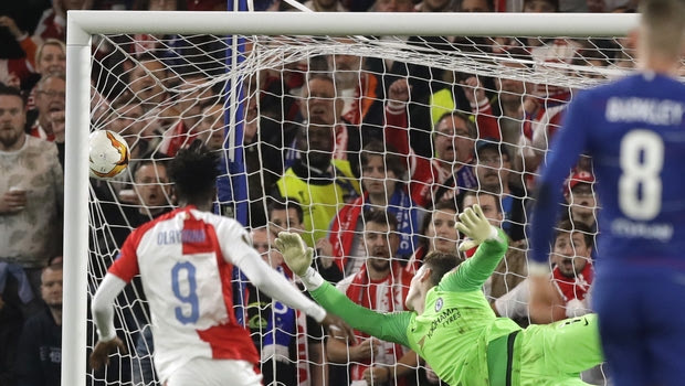Chelsea goalkeeper Kepa Arrizabalaga dives but fails to stop Slavia's Petr Sevcik's second goal, and his team's third, during the Europa League quarterfinal, second leg, soccer match between Chelsea and Slavia Prague at Stamford Bridge stadium in London, Thursday, April 18, 2019. (AP Photo/Matt Dunham)