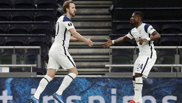Tottenham's Harry Kane, left, celebrates after scoring his side's second goal during the Europa League round of 16, first leg, soccer match between Tottenham Hotspur and Dinamo Zagreb at the Tottenham Hotspur Stadium in London, England, Thursday, March 11, 2021. (AP photo/Alastair Grant, Pool) @ 2021 Alastair Grantn/Associated Press