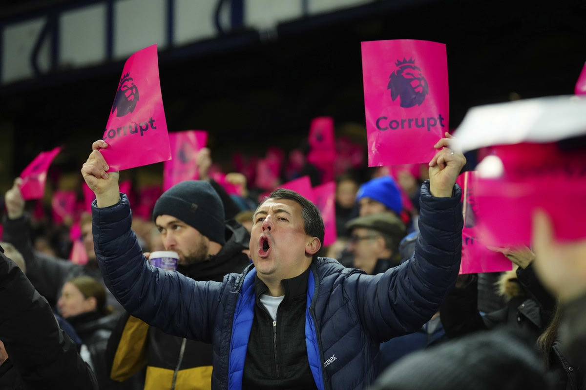 Οι οπαδοί της Έβερτον σήκωσαν κόκκινες κάρτες που έγραφαν τη λέξη "διαφθορά" και είχαν το σήμα της Premier League κατά τη διάρκεια του αγώνα πρωταθλήματος με την Μάντσεστερ Γιουνάιτεντ | 26 Νοεμβρίου 2023