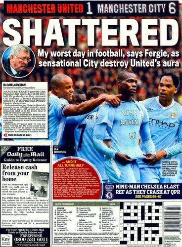 Ναι, ναι, ναι. Το κείμενο γράφτηκε με αφορμή το θρίαμβο της Σίτι, ξεκίνησε με μεγάλη νίκη των “πολιτών” και τελειώνει με το μεγαλύτερο χαστούκι που έχουν δώσει στους γείτονές τους, μαζί με το χτεσινό. Οι “μπλε” μπορούν να καμαρώνουν ότι έχουν ξαναρίξει 6 γκολ στη Γιουνάιτεντ εκτός έδρας, πριν μάλιστα από 8μιση δεκαετίες, πάλι για αγώνα πρωταθλήματος και σε μια χρονιά που οι “κόκκινοι διάβολοι τερμάτισαν 9οι και η Σίτι υποβιβάστηκε. Τι είπατε, είναι παλιά; Στην Αγγλία, η παράδοση, οι επιτυχίες και η ιστορία δεν γνωρίζουν ηλικία. Η τελευταία μάλιστα, έχει δείξει ότι επαναλαμβάνεται…