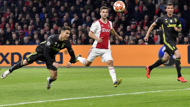 Juventus' Cristiano Ronaldo, left, scores his side's opening goal during the Champions League quarterfinal, first leg, soccer match between Ajax and Juventus at the Johan Cruyff ArenA in Amsterdam, Netherlands, Wednesday, April 10, 2019. (AP Photo/Martin Meissner) AP Photo/Peter Dejong