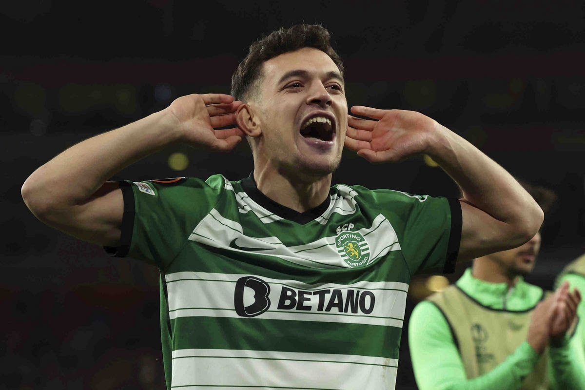 Ο Πέντρο Γκονσάλβες της Σπόρτινγκ πανηγυρίζει την πρόκριση εις βάρος της Άρσεναλ από τη φάση των 16 του Europa League στο "Έμιρεϊτς", Λονδίνο | Πέμπτη 16 Μαρτίου 2023 © 2023/Ian Walton/AP IMAGES