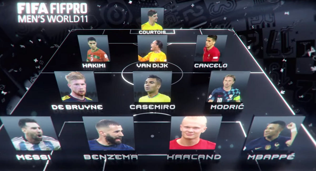 Η καλύτερη ενδεκάδα στους άνδρες: Τιμπό Κουρτουά, Ασράφ Χακίμι, Ζοάο Κανσέλο, Βίρχιλ Φαν Ντάικ, Κέβιν Ντε Μπρόινε, Λούκα Μόντριτς, Κασεμίρο, Λιονέλ Μέσι, Κιλιάν Εμπαπέ, Καρίμ Μπενζεμά, Έρλινγκ Χάλαντ.