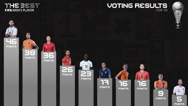 O Μέσι κατέκτησε το βραβείο συγκεντρώνοντας 46 πόντους στην ψηφοφορία της FIFA (συμμετείχαν αρχηγοί και προπονητές εθνικών ομάδων καθώς και δημοσιογραφοι) έναντι 38 του Φαν Ντάικ και 36 του Ρονάλντο, ενώ την πρώτη δεκάδα συμπλήρωσαν οι Σαλάχ (26 πόντοι), Μανέ (23 πόντοι), Εμπαπέ (17 πόντοι), Ντε Γιονγκ (16 πόντοι), Αζάρ (16 πόντοι), Ντε Λιχτ (9 πόντοι) και Κέιν (5 πόντοι).