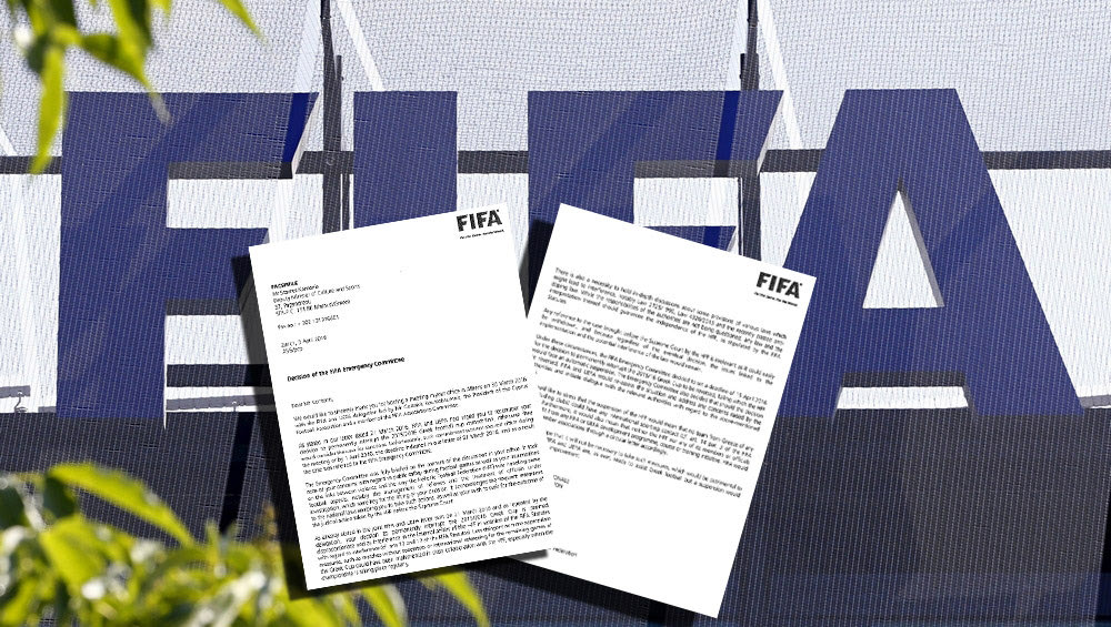 Όπως αναφερόταν στην επιστολή μας με ημερομηνία 21 Μαρτίου 2016, η FIFA και η UEFA σας κάλεσαν να αναθεωρήσετε την απόφασή σας να διακόψετε οριστικά τη διοργάνωση του ποδοσφαιρικού Κυπέλλου Ελλάδας 2015/2016, διαφορετικά θα εξέταζαν την υπόθεση για επιβολή κυρώσεων. Δυστυχώς, τέτοια δέσμευση δεν εξασφαλίστηκε είτε κατά τη διάρκεια της συνάντησης είτε έως την 1η Απριλίου 2016, προθεσμία που τέθηκε στην επιστολή μας της 21ης Μαρτίου 2016, και ως εκ τούτου η υπόθεση παραπέμφθηκε στην Επιτροπή Εκτάκτων Θεμάτων της FIFA.