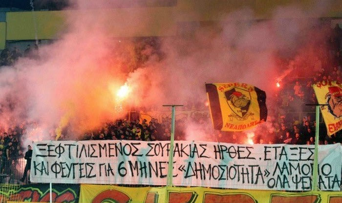 Αρχικά με πανό που αναρτήθηκε στις θύρες 3 και 2 και στην συνέχεια με συνθήματα στο δεύτερο ημίχρονο ενώ φυγαδεύτηκε μετά τη λήξη.