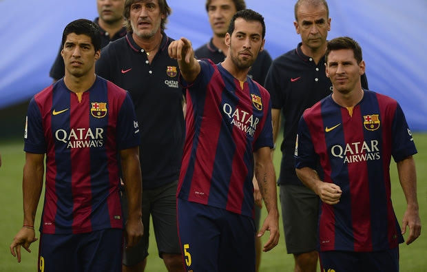 FC Barcelona's Luis Suarez, from Uruguay, left, looks on near of Barcelona's Sergio Busquets, second left, and Lionel Messi, from Argentina, during his official presentation prior of the Joan Gamper trophy match Between FC Barcelona and Leon at the Camp Nou in Barcelona, Spain, Monday, Aug. 18, 2014. (AP Photo/Manu Fernandez)