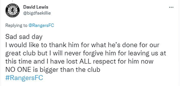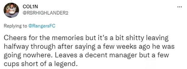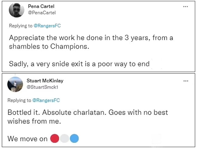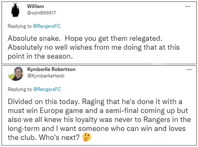 “Εκτιμώ τη δουλειά που έκανε στα τρία χρόνια, από το ναδίρ, πρωταθλητές. Δυστυχώς, μία πολύ ύπουλη έξοδος είναι κακός τρόπος για το τέλος”, έγραψε ένα tweet. “Τα γκρέμισε. Απόλυτος τσαρλατάνος. Φεύγει χωρίς ευχές από μένα. Προχωράμε”, ήταν μια άλλη τοποθέτηση. “Μεγάλο φίδι. Ελπίζω να τους υποβιβάσεις. Σίγουρα καμία ευχή από εμένα αυτήν τη στιγμή της σεζόν”, έγραψε σε άλλο tweet ένας απογοητευμένος φίλαθλος της Ρέιντζερς.