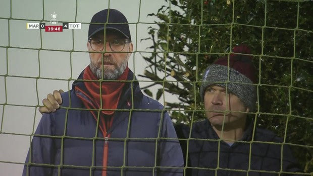 Ένας απίθανος φίλος της Λίβερπουλ παρουσιάστηκε έξω από το γήπεδο της αναμέτρησης του FA Cup ανάμεσα στη Μαρίν και την Τότεναμ με ένα ομοίωμα του Γιούργκεν Κλοπ.