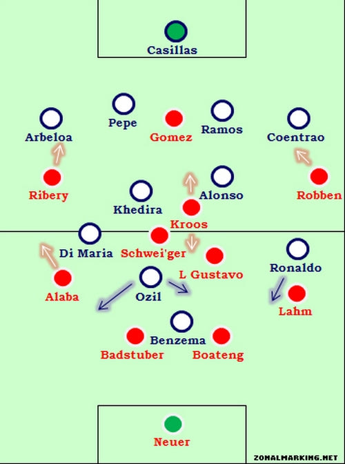 Περίπου τον ίδιο σχηματισμό είχαν οι δύο ομάδες. Αμφότερες χρησιμοποίησαν το 4-2-3-1 ή τουλάχιστον μία παραλλαγή του. Επίσης, οι εξτρέμ τους συνέκλιναν προς τα μέσα. Αυτή η κίνηση επέτρεπε στους πλάγιους μπακ να ανεβαίνουν. Οι μπακ της Ρεάλ σε όλα τα ευρωπαϊκά παιχνίδια είναι πολύ προσεκτικοί εκτός έδρας. Έτσι ήταν οι μπακ της Μπάγερν, οι οποίοι είχαν μεγαλύτερη επιρροή στο παιχνίδι με τα ανεβάσματά τους. Η πιο χαρακτηριστική φάση ήταν αυτή του τελευταίου λεπτού με τον Φίλιπ Λαμ να δημιουργεί το γκολ του Γκόμεζ.