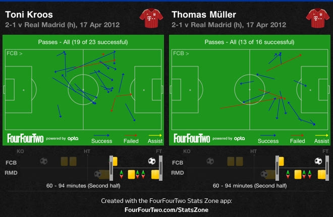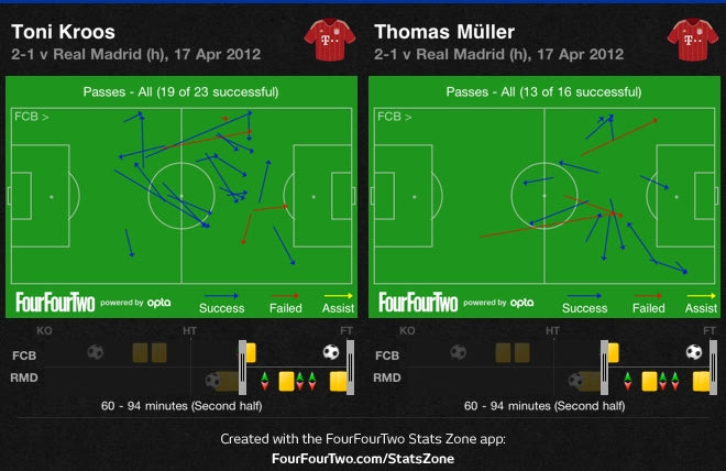 Με τον Εζίλ να είναι εκτός θέσης η Μπάγερν απλώς είχε στο κέντρο τρεις παίκτες έναντι δύο. Οι Αλόνσο και Σάμι Κεντίρα δεν ήξεραν αν έπρεπε να πιέσουν ή να παραμείνουν στις θέσεις τους. Συνήθως έδιναν χώρους, η άμυνα δεν ανέβαινε και άφηναν την Μπάγερν να κυκλοφορεί την μπάλα. Ο Κρος έπαιζε πολύ καλά, έμενε κυρίως ψηλά, όταν η Μπάγερν είχε την μπάλα (αυτός και ο Γκόμεζ δεν πίεζαν την άμυνα της Ρεάλ, αλλά έμεναν κοντά σε εκείνους που είχαν την κατοχή της μπάλας, απόρροια του οποίου είναι να κερδίζουν τις μπάλες από τους Αλόνσο και Κεντίρα συχνά, με τον Γκόμεζ να βοηθάει αρκετά), αλλά υπερφόρτωνε μία πλευρά όταν η Μπάγερν είχε την κατοχή της μπάλας, ενώ βοηθούσε τον Σβαϊνστάιγκερ επιθετικά. Ο Γκουστάβο έμενε πίσω για να προσέχει τις κινήσεις του Εζίλ.