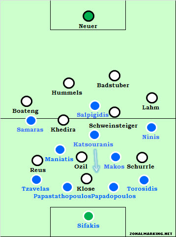 Η Ελλάδα προσπάθησε να είναι προσεκτική. Οι τέσσερις αμυντικοί σπάνια ανέβαιναν, καθώς οι δύο πλάγιοι πιεζόντουσαν αποτελεσματικά από τους Ρόις και Μίλερ. Οι επιλογές στο κέντρο είχαν πολύ ενδιαφέρον: ο Κώστας Κατσουράνης έπαιξε σε έναν περίεργο επιτελικό ρόλο. Όταν η Ελλάδα είχε τη μπάλα (ή όταν είχαμε εκτέλεση ελεύθερου από τον τερματοφύλακα) ήταν ο μέσος που βρισκόταν πιο κοντά στους επιθετικούς, αλλά όταν η Γερμανία είχε την κατοχή, συχνά γινόταν ο τελευταίος από τους παίκτες του κέντρου.