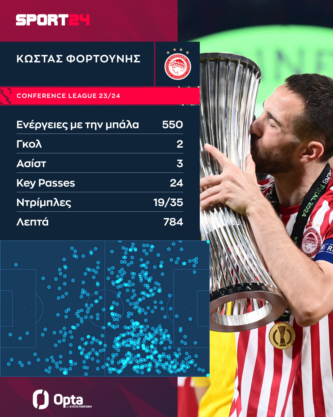 Ο Κώστας Φορτούνης ήταν ο αρχηγός του Ολυμπιακού που σήκωσε την κούπα του Conference League και έβαλε κάτι παραπάνω από ένα λιθαράκι για την κατάκτησή του. Δείτε όσα έκανε ο Έλληνας μεσοεπιθετικός στην ιστορική πορεία των ερυθρόλευκων.