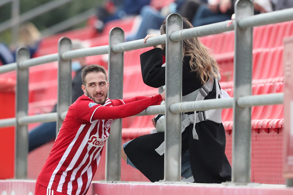 Ο Κώστας Φορτούνης πανηγυρίζει γκολ με τη φανέλα του Ολυμπιακού με τη σύντροφο και την κόρη του