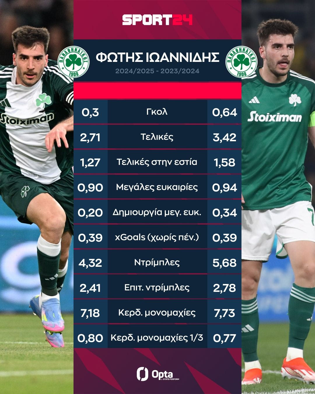 Εν κατακλείδι, η φετινή χρονιά είναι πισωγύρισμα για τον Φώτη Ιωαννίδη, όσον αφορά το σκοράρισμα. Οι λόγοι πολλοί: Η “λαίλαπα” του Ντιέγκο Αλόνσο, το μεγάλο βάρος που φορτώθηκε με το νέο του συμβόλαιο και το περιβραχιόνιο του αρχηγού του Παναθηναϊκού, αλλά και το τεράστιο “πρέπει” για την κατάκτηση του πρωταθλήματος μετά από 14 χρόνια. Τα νούμερα δείχνουν ότι παραμένει ένας επιθετικός που… τρέχει την αντίπαλη άμυνα, συνεχώς βάζει το κορμί του στις μονομαχίες και παλεύει όσο ελάχιστοι στην επίθεση. Βρίσκεται μέσα στις φάσεις, έχει τελικές και προφανώς το έλειψε ένα καλό σερί με γκολ για να τονώσει την ψυχολογία του και να επιστρέψει στα γνωστά του στάνταρ.
