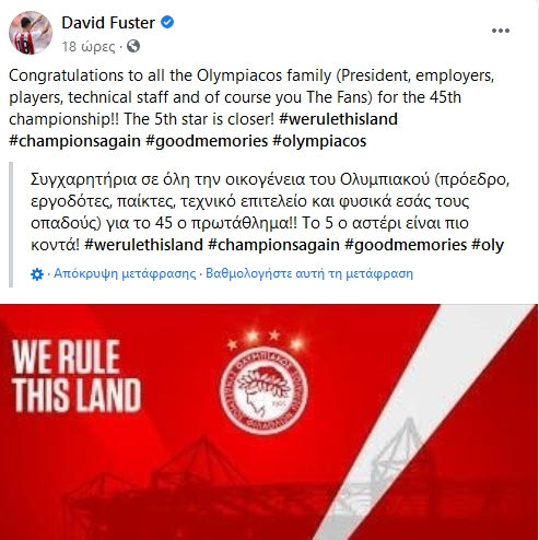 Μέσω του λογαριασμού του στο Facebook, ο Νταβίντ Φουστέρ αποθέωσε τον Ολυμπιακό για την κατάκτηση του 45ου πρωταθλήματος στην ιστορία του, αναφέροντας πως το 5ο αστέρι είναι πιο κοντά. Παράλληλα, έδωσε συγχαρητήρια στη διοίκηση, το προπονητικό τιμ, τους παίκτες και του εργαζομένους στην ομάδα του Πειραιά για το φετινό επίτευγμα.