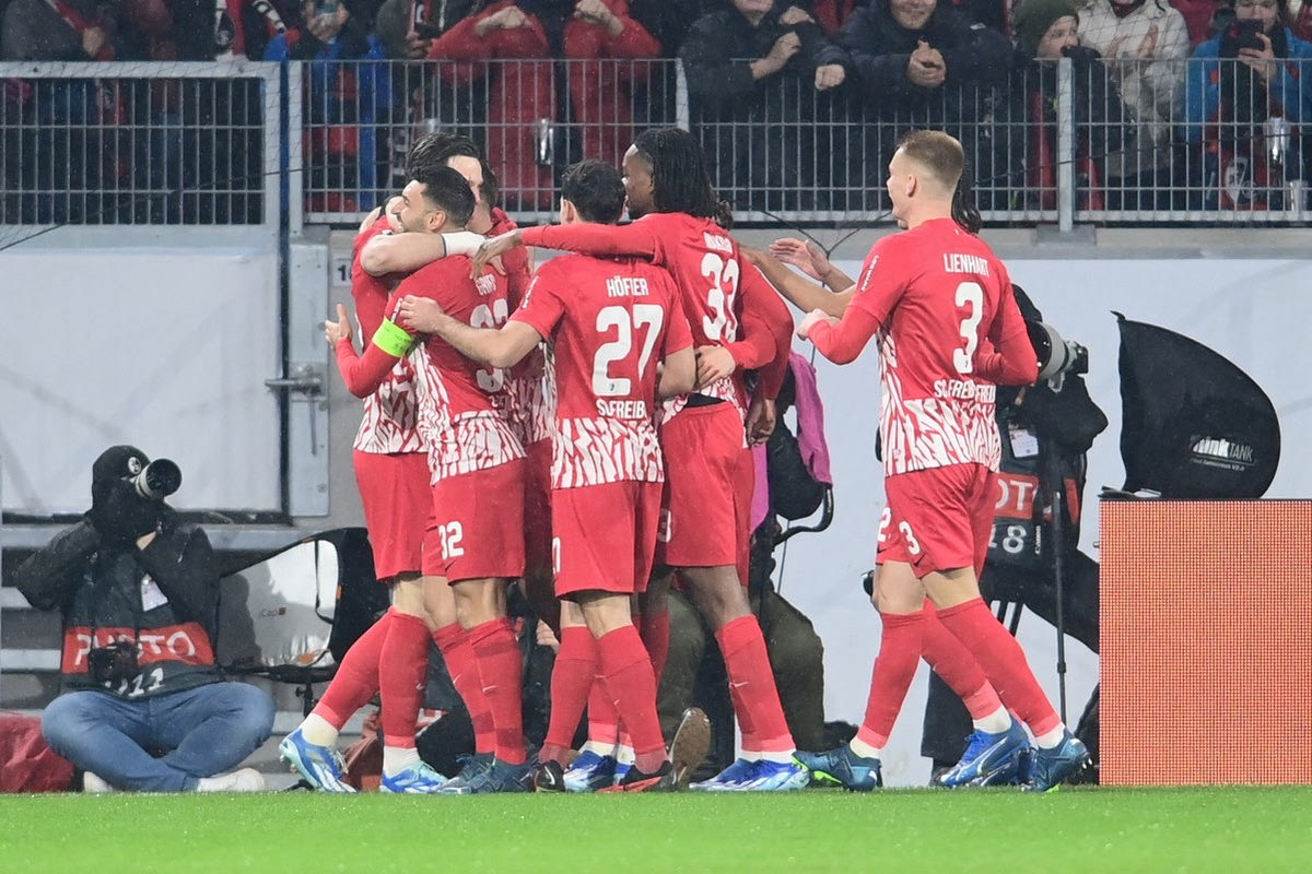 Οι παίκτες της Φράιμπουργκ πανηγυρίζουν ένα γκολ επί του Ολυμπιακού