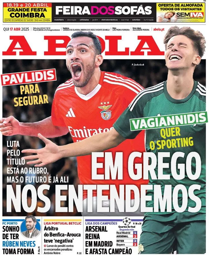 Σαν να διαβάζεις ελληνική εφημερίδα βλέποντας το πρωτοσέλιδο της A Bola στο φύλλο της Μεγάλης Πέμπτης. Οι Πορτογάλοι έβαλαν στην πρώτη σελίδα και τον Βαγγέλη Παυλίδη και τον Γιώργο Βαγιαννίδη.