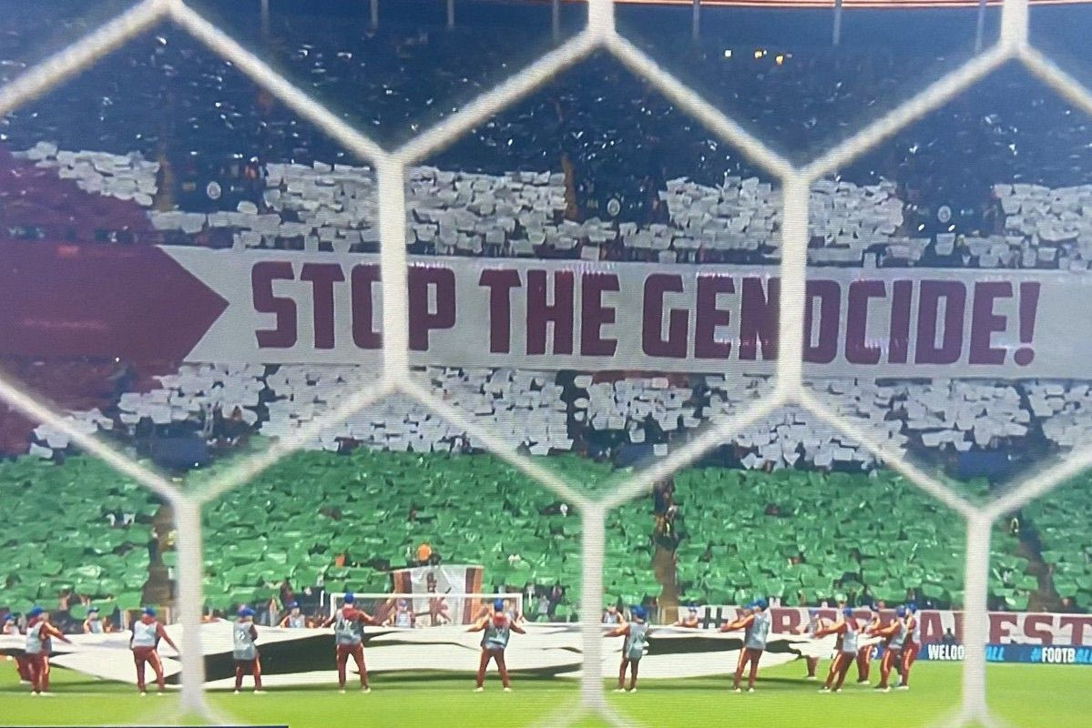 Αυτή τη φορά το έκαναν με ένα τεράστιο κορεό που απεικόνιζε την παλαιστινιακή σημαία, με το μήνυμα “σταματήστε την γενοκτονία”. Παράλληλα, υπήρχε και ένα δεύτερο πανό, το οποίο έγραφε: “Λευτεριά στην Παλαιστίνη”.