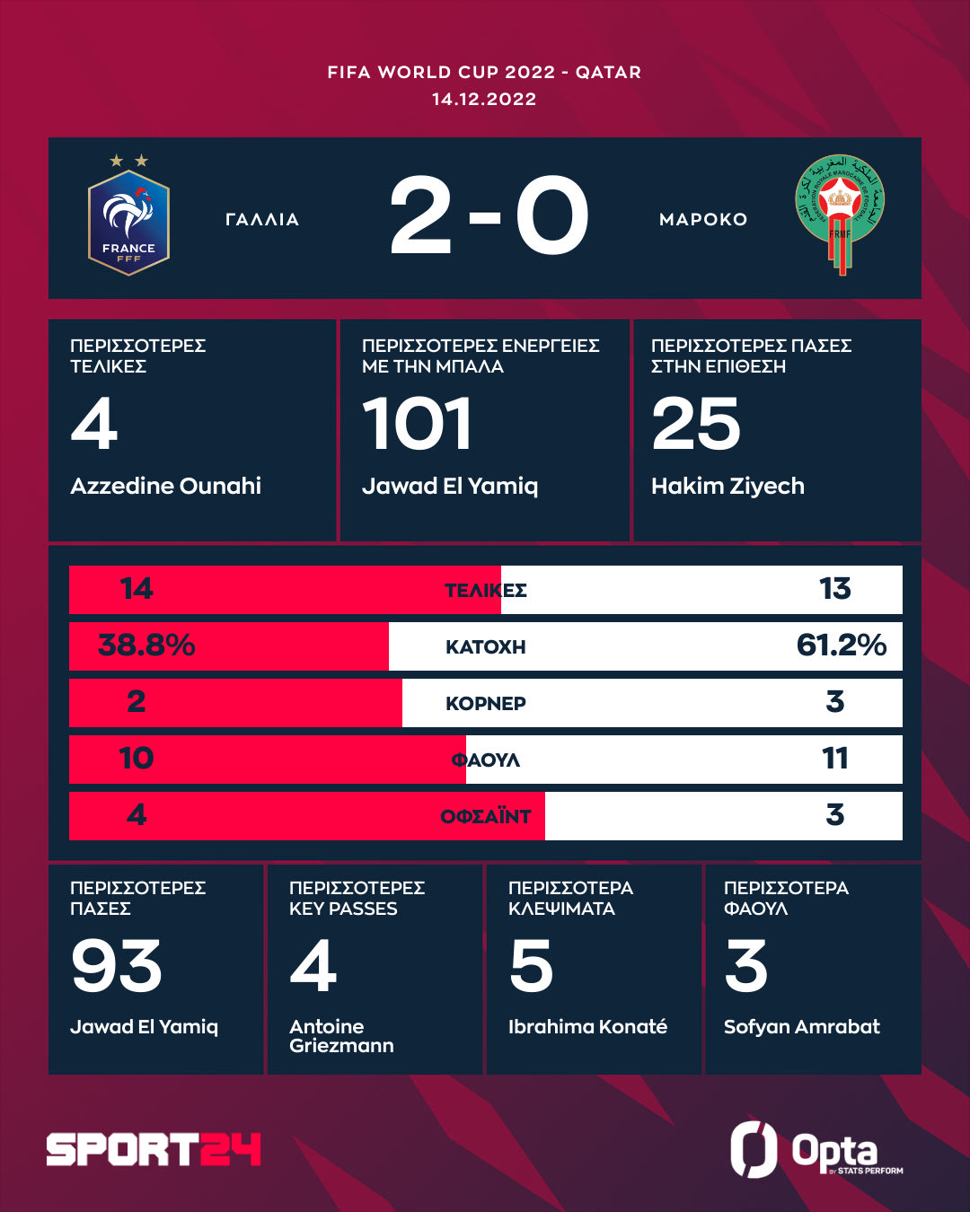 Η Γαλλία συνάντησε ισχυρή αντίσταση από το αξιόμαχο Μαρόκο όμως το υπέταξε με 2-0 παίζοντας με φινέτσα παγκόσμιας πρωταθλήτριας και έκλεισε θέση στον μεγάλο τελικό, όπου θα διεκδικήσει κόντρα στην Αργεντινή τον δεύτερο σερί τίτλο της.