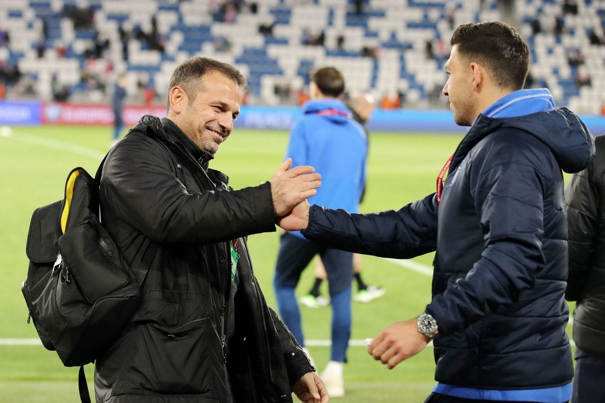 Ο Ντέμης Νικολαΐδης με τον Τάσο Μπακασέτα πριν από την αναμέτρηση της Ελλάδας με τη Γεωργία στο "Μπόρις Παϊτσάτζε", Τιφλίδα | Τρίτη 26 Μαρτίου 2024