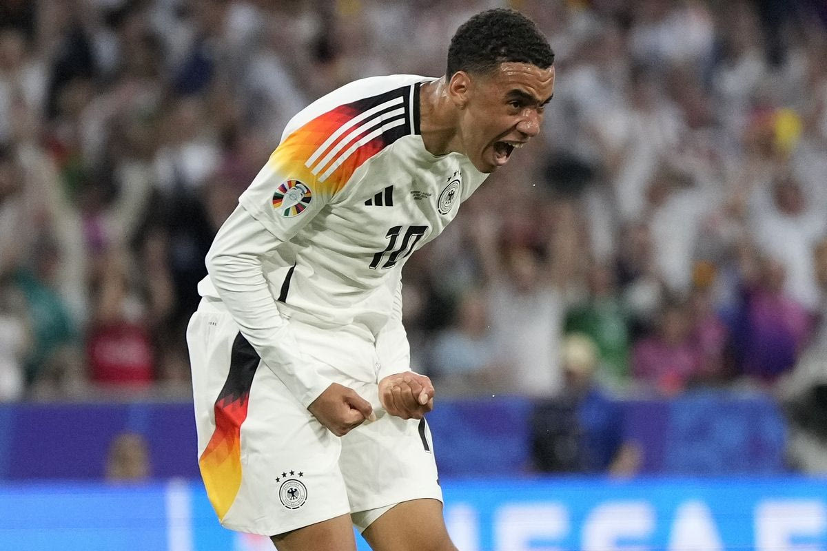 Germany's Jamal Musiala celebrates after scoring his side's second goal during a Group A match between Germany and Scotland at the Euro 2024 soccer tournament in Munich, Germany, Friday, June 14, 2024. (AP Photo/Matthias Schrader)